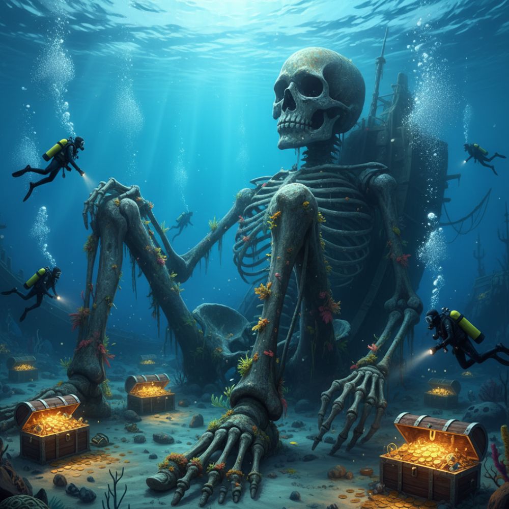 Aris dispatched a team of divers. As they moved through the water, their flashlights danced across the scene, highlighting the sheer scale of the discovery. One diver, a seasoned explorer named Kenji, found a large, stone tablet clutched in the skeleton’s massive hand. On it, etched in a language no one recognized, were symbols that seemed to tell a story of a forgotten race, of guardians of the deep, and of a cataclysm that had plunged them into the ocean’s embrace.