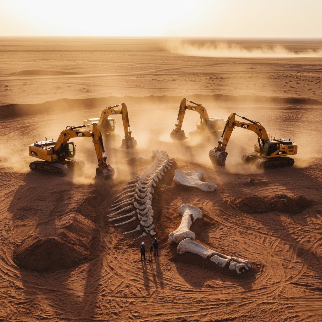 “Another few meters, carefully, Team Alpha!” he shouted over the din of heavy machinery. Four automated excavators, custom-fitted with ground-penetrating radar and precision tools, hummed around the perimeter of the colossal fossil. They weren’t the clumsy earthmovers of old; these machines were extensions of the paleontologists’ will, each scoop of dust meticulously calibrated to avoid damage. The sun, a molten disc on the horizon, bathed the scene in a fiery, ethereal glow, throwing the immense bones and the busy machines into sharp relief. Dust, fine as flour, danced in the golden light, a constant companion in this harsh yet beautiful theatre of discovery.