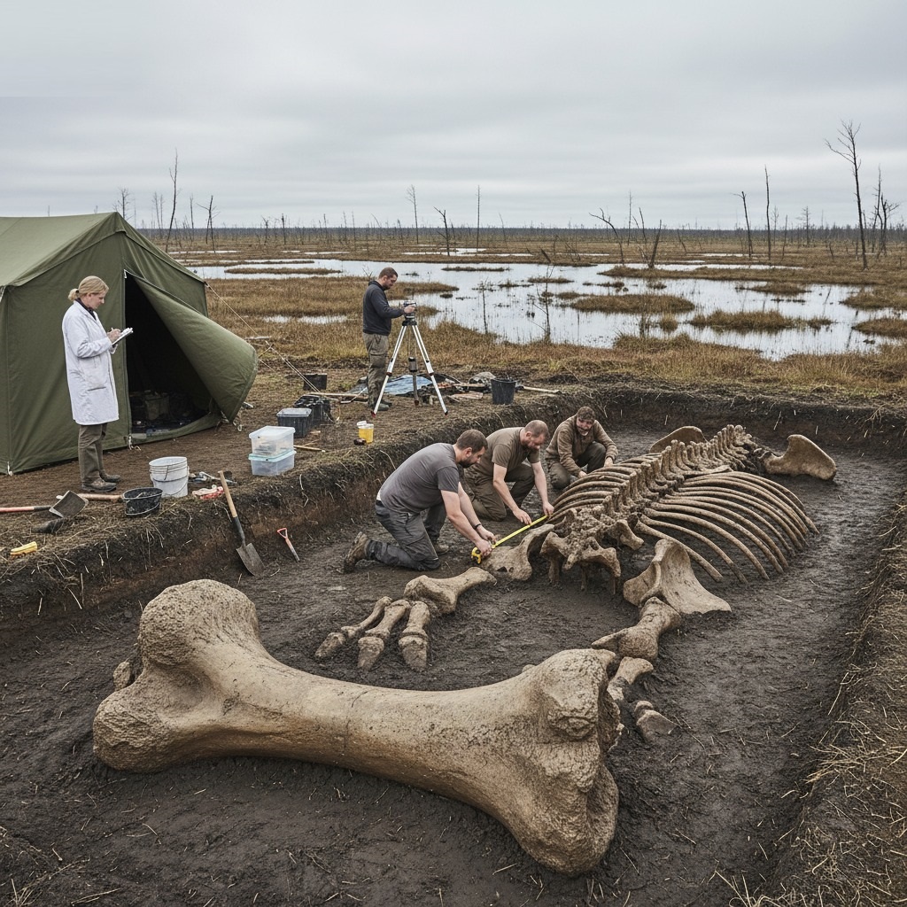As the day wore on, two of her assistants knelt, meticulously measuring the ancient bones with yellow tape, their focused expressions belying the biting insects and the humidity. Another worked at a small field station near the green canvas tent, cataloging findings, his silhouette against the brooding sky. Dr. Vance, clipboard in hand, jotted down observations, her mind already racing with hypotheses, eager to piece together the narrative of this magnificent creature’s final resting place.