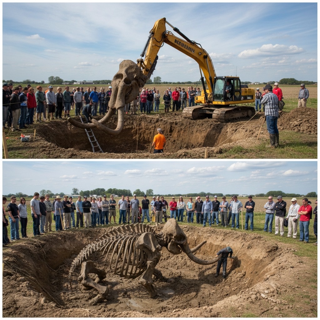 As word spread, the sleepy Iowa landscape became a hub of controlled chaos. The top image captures the sheer scale of the operation: a colossal yellow excavator, repurposed from agricultural labor to delicate surgery, carefully hoists the massive skull and formidable tusks from the muddy pit. A crew of dedicated archaeologists, students, and curious locals—their faces a mix of awe and concentration—surround the excavation. Ladders lean against the pit’s edge, ropes secure the ancient trophy, all under the watchful, partly cloudy Midwestern sky. Every movement is precise, every hand steady, knowing they are handling a relic from a bygone era.