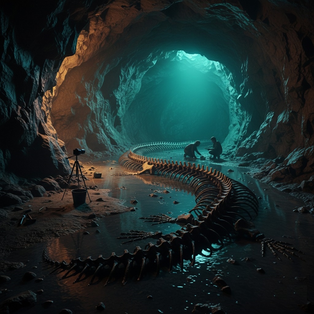 The creature’s bones, stained an ancient ochre by the mineral-rich water, shimmered under their combined light. Its flipper-like limbs were splayed, as if caught mid-swim, an eternal guardian of this subterranean lake. The skull, surprisingly intact, rested near the edge of a deeper pool, its empty eye sockets seeming to gaze up at them from the abyss of time. This was no ordinary find; this was monumental.