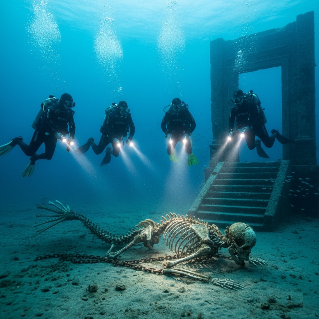 What they found defied every known biological and historical record. Illuminated by their powerful lights, nestled in the fine sand at the base of a crumbling, monumental stone archway – remarkably preserved despite millennia underwater – lay a colossal skeleton. Its upper half was unmistakably humanoid, with a distinctly human skull and ribcage. But from the waist down, it transitioned into an enormous, segmented caudal fin, perfectly articulated. It was unmistakably a mermaid. And it was bound by thick, corroded iron chains, tethered to ancient stone anchors embedded in the seabed.