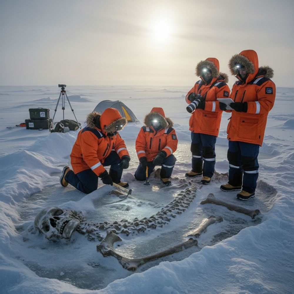 Aris ran a gloved hand over his heavily insulated jacket, his gaze fixed on the ancient face staring up through its icy tomb. The skull, though stripped of flesh, held a haunting dignity. Ribs, spine, and the long bones of the limbs were all present, connected as if in serene slumber. The ice was so transparent that every detail, every subtle curve of bone, was visible, untouched by the ravages of time and scavengers.