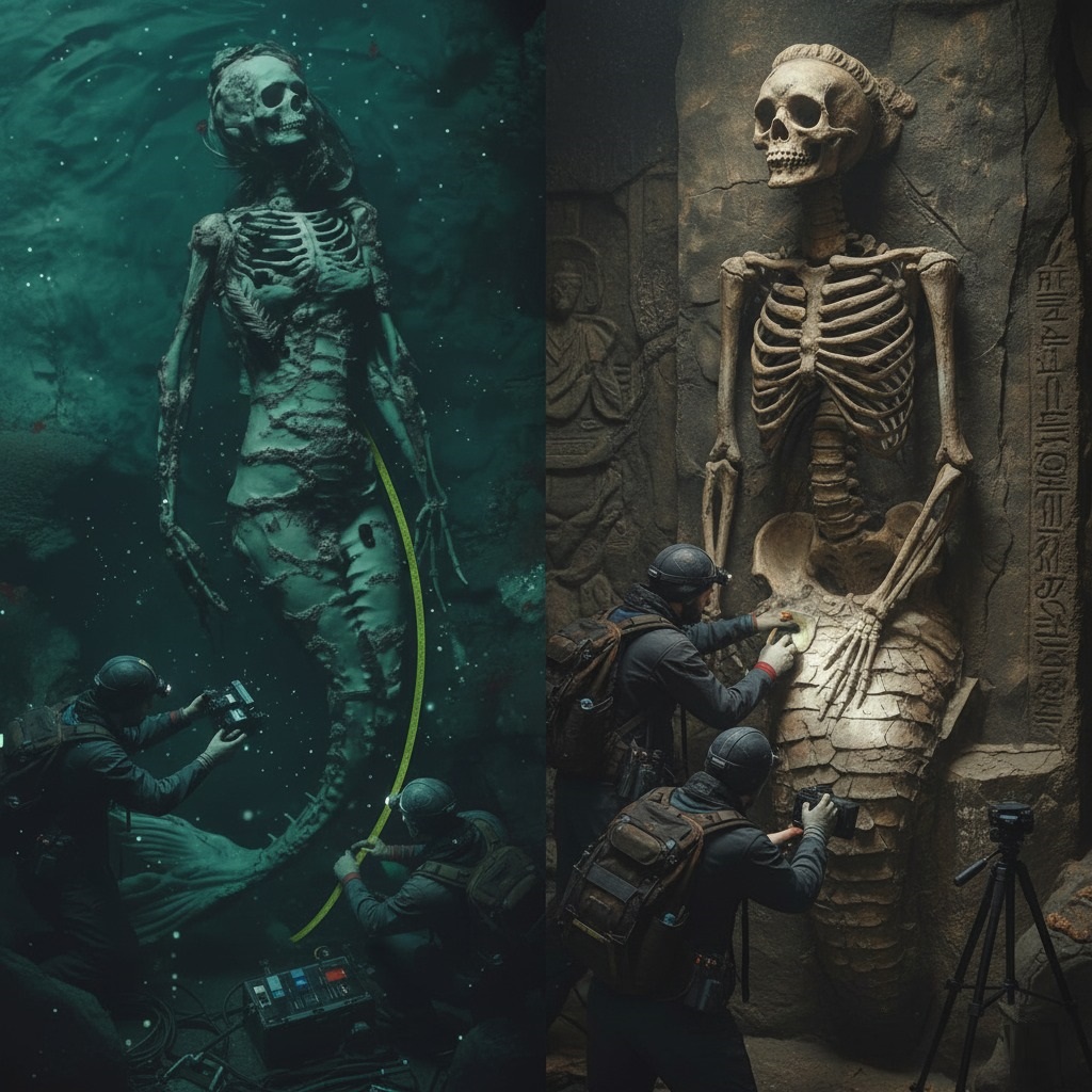 Meanwhile, high in the remote, mist-shrouded Andes of Peru, a separate, equally astounding discovery is made in 2023. Archaeologist Dr. Elena Ramirez, specializing in pre-Incan civilizations, stumbles upon a previously uncharted cavern system beneath the ancient Nazca lines. Deep within, carved into the very bedrock of a subterranean temple, lies a massive bas-relief of a mermaid-like skeletal figure. Unlike Aris’s discovery, this one is fixed, immortalized in stone. The surrounding walls are covered in hieroglyphs depicting celestial navigators and beings of the deep. Elena’s team, utilizing laser scanners and ground-penetrating radar, carefully uncovers more of the intricate carvings. Two archaeologists meticulously brush away centuries of dust, one capturing every detail with a high-resolution camera mounted on a tripod, another carefully examining the texture of the stone with gloved hands. The skeletal mermaid here is clearly an object of reverence, a deity or an ancestor, perhaps even a record of a visitation.