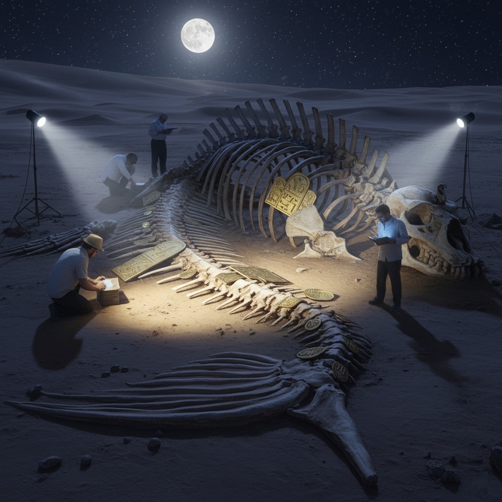 “But what other explanation fits?” she countered, sweeping her gaze across the skeletal marvel. The Great Leviathan, a sentinel of deep time, lay before them. Its presence in the modern Atacama, adorned with human-era gold, was a profound question etched into the very fabric of the Earth. As the moon slowly traversed the sky, casting its silent judgment, the team knew their work was far from over. They weren’t just unearthing bones; they were challenging the very timeline of civilization, one golden tablet at a time.