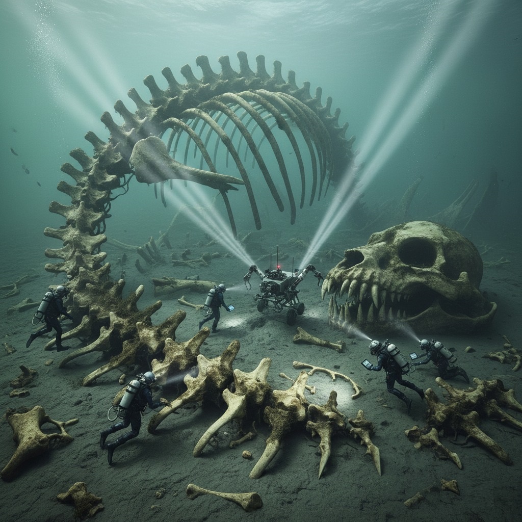 Days turned into weeks. The PERAI site became a hub of global scientific interest, a carefully guarded secret from public hysteria. Underwater robotic arms, guided by hyper-sensitive sensors, meticulously cleared away millennia of silt and sediment. Piece by agonizing piece, the creature emerged. Ribs, like the bowed timbers of a thousand-year-old cathedral, formed vast, skeletal arches. Then, the skull.