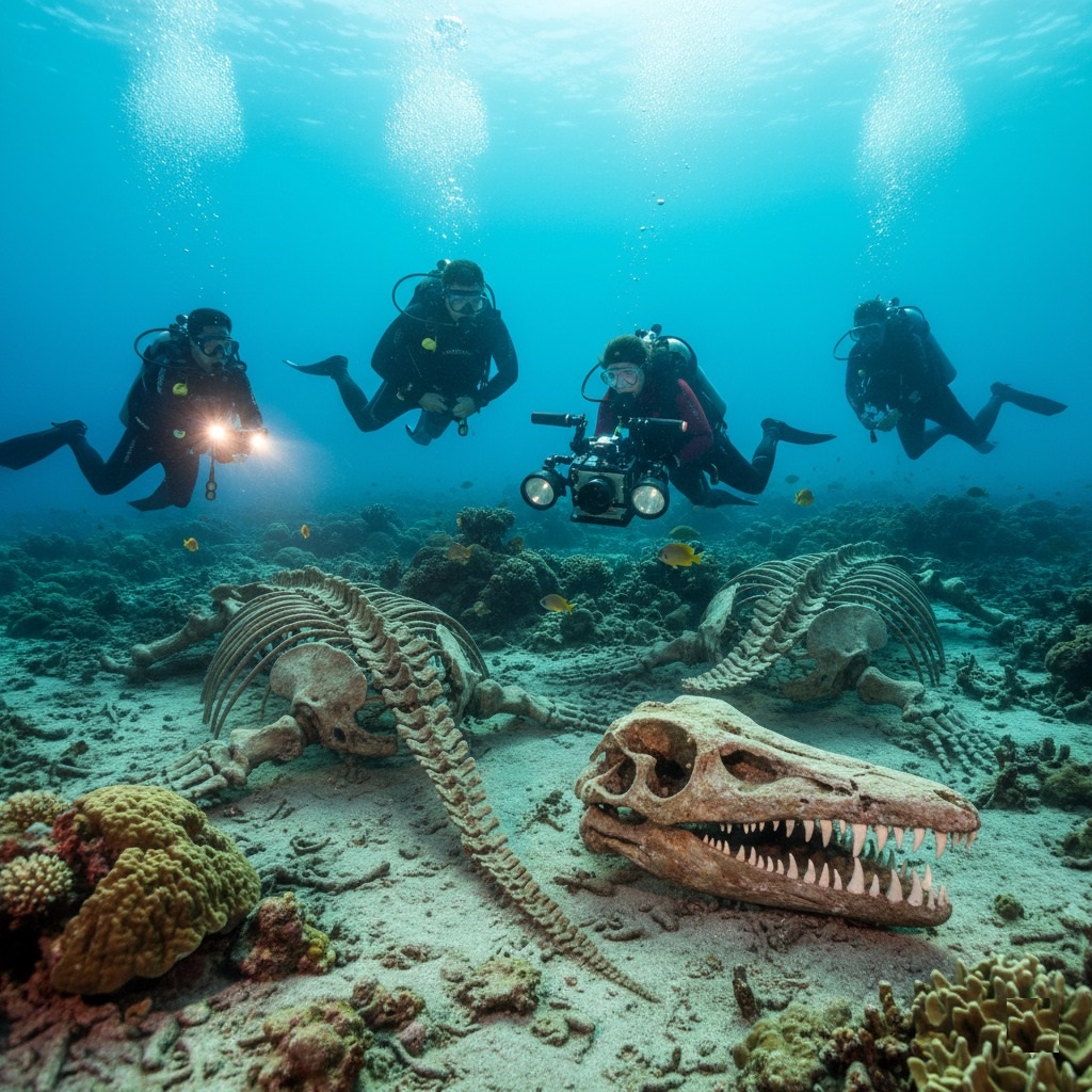 His team, a seasoned crew of underwater archaeologists and photographers, followed him into the turquoise embrace. Suddenly, Aris signalled, his gloved hand pointing downwards. There, nestled amongst ancient coral formations and undisturbed sand, lay the unmistakable contours of colossal bones.