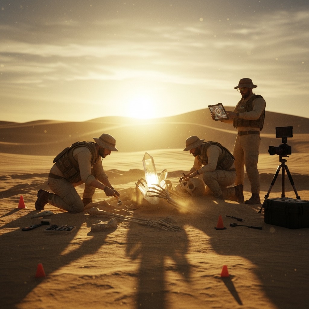 Thorne descended swiftly, his heart quickening with the familiar thrill of discovery. Anya was kneeling beside a partially unearthed human skeleton, its bones bleached by centuries under the unforgiving sun. But it wasn’t the skeleton itself that made his breath catch. Clutched in the skeletal hand, emanating a soft, pulsating golden light, were three large, perfectly formed crystals. They glowed with an ethereal intensity that defied any known mineral property, casting long, dancing shadows across the sand.
