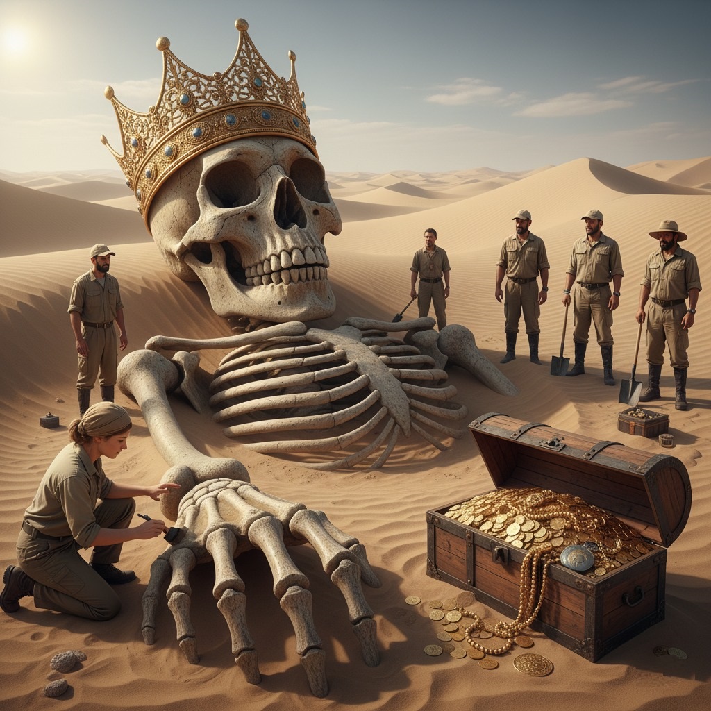 The artifacts from the chest were being carefully cataloged and studied. Their unique iconography hinted at a sophisticated, unknown culture. The crown itself, a masterpiece of ancient metallurgy, suggested a being of immense power and status. Was this the “King of Ad,” a legendary civilization swallowed by the sands, spoken of in ancient texts and local folklore? Could this truly be one of the giants of Ubar, the lost city of a thousand pillars, rumored to have been buried in the sands as divine punishment?