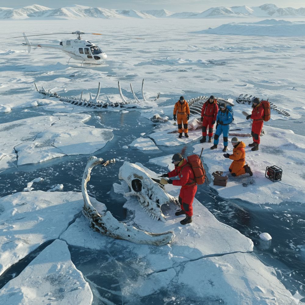 Two weeks prior, a routine drone sweep had picked up an anomaly: peculiar linear formations beneath the shifting ice. What they found upon landing their helicopter was beyond their wildest dreams. Spread across a vast, fractured expanse of ancient sea ice, gleaming stark white against the deep blues and grays, lay the partial skeletons of what could only be described as leviathans.