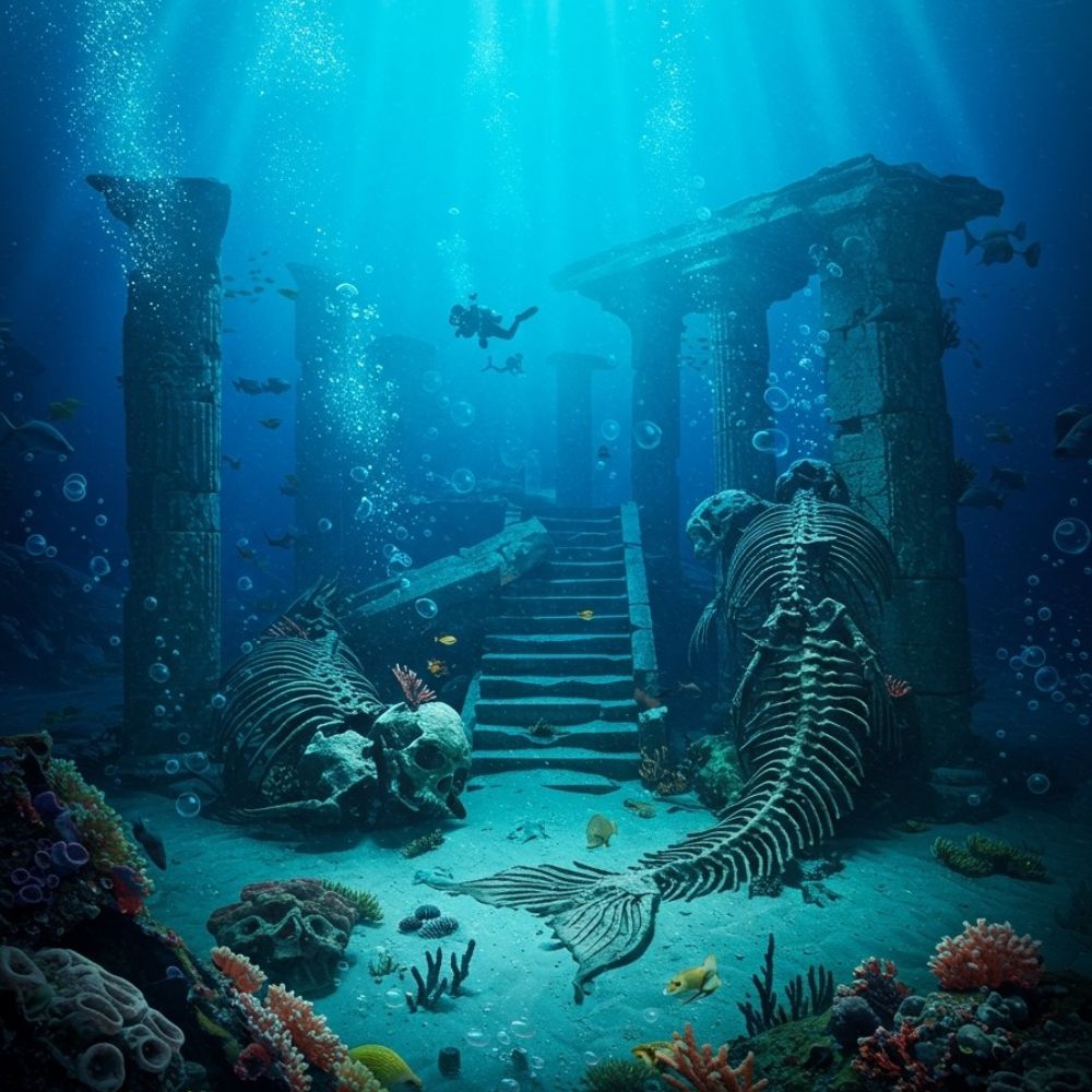 He finned closer, his dive light cutting through the shadows, revealing a wide, stone staircase leading upwards into the heart of the structure. It was here, at the base of these hallowed steps, that the scene took on a breathtaking, almost mythical quality. On either side, massive skeletons lay half-buried in the sandy seabed. Not human, not even common marine life. These were the gargantuan remains of colossal creatures, their rib cages vast caverns, their spinal columns stretching like ancient serpents across the ocean floor. Lena’s voice echoed his thoughts, “My god, Aris… what were they?” The sheer scale suggested ancient whales, perhaps even a species unknown, adding another layer of wonder and terror to this forgotten realm.