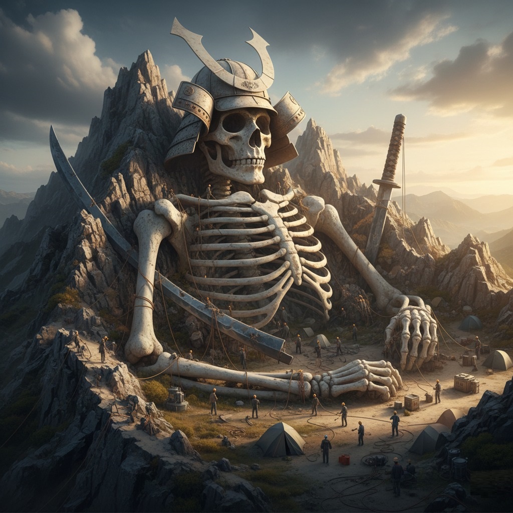 But the most breathtaking revelation came with the discovery of the skull. Enormous and perfectly preserved, it was adorned with a massive, weathered samurai helmet, crafted from an unknown, incredibly durable alloy. Nearby, half-buried in the compacted earth, lay a colossal katana, its hilt intricately carved, its blade wider than a man. The sheer magnitude of the find pointed to one legendary figure from Japanese folklore: Kenshin, the peerless warrior, often depicted as a giant. For centuries, he was thought to be nothing more than a myth, a poetic exaggeration of human strength and prowess. Now, his impossible form lay before them, a silent, monumental testament to a history far grander and stranger than imagined.