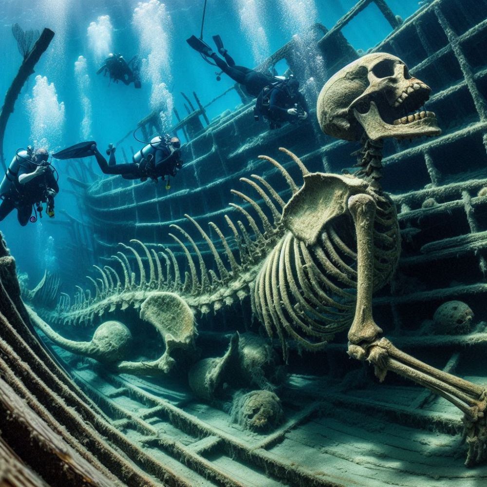 The image released by the expedition team shows a scene of haunting beauty and terror. Resting on the wooden beams of the ship is a skeletal structure measuring approximately 15 feet in length. The upper torso resembles that of a human, though scaled up to gigantic proportions, while the lower spine extends into a long, serpentine tail, lacking the pelvic structure of a bipedal human.